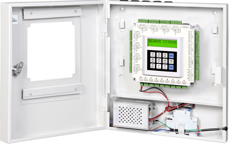 A Door Interlocking Terminal is a control unit that ensures only one door in a sequence (airlock) can be opened at any given time. This system is crucial in sensitive environments, like cleanrooms, to maintain air pressure and prevent contamination. It uses indicators (LEDs/buzzers) to guide user traffic and can manage multiple doors from a single controller. The terminal features audio and visual indicators (buzzer and LEDs) to guide users, and it offers user-configurable door matrix logic and supports both switch and switchless operation modes.